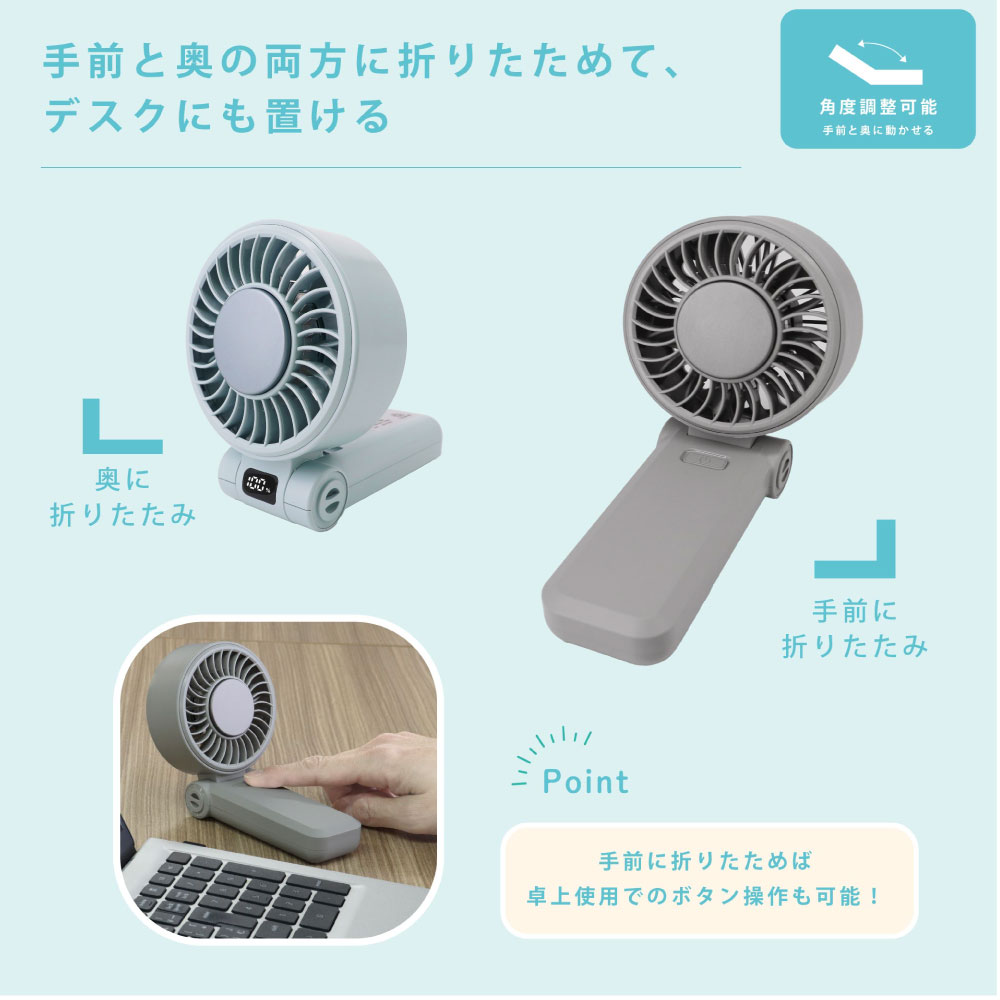 折りたたんで卓上で使用する事もできます。手前に折りたためばボタンが隠れないので、風量操作も可能です。