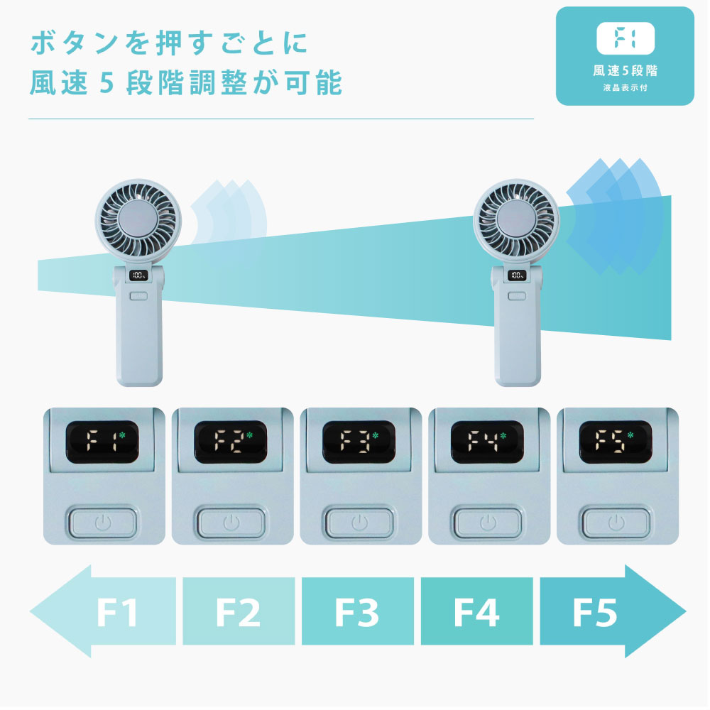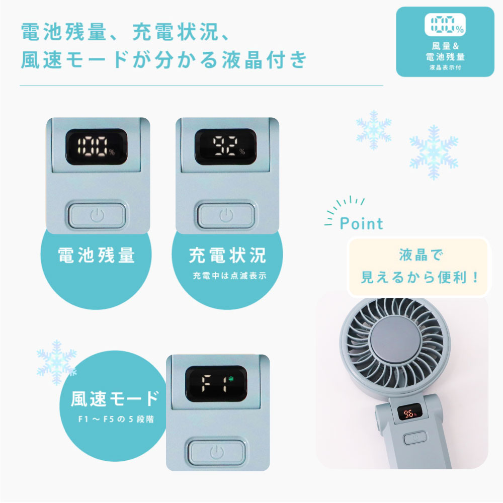 電池残量、充電状況、風速モードが表示される液晶付き。残り残量が見えるので、充電切れの前に充電することができ、とっても便利です。