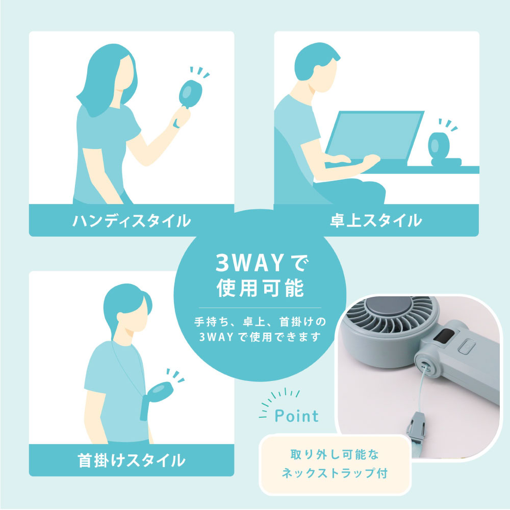 ストラップ、手持ち、卓上ファンの3Wayで使用可能。付属のネックストラップは取り外し可能です。